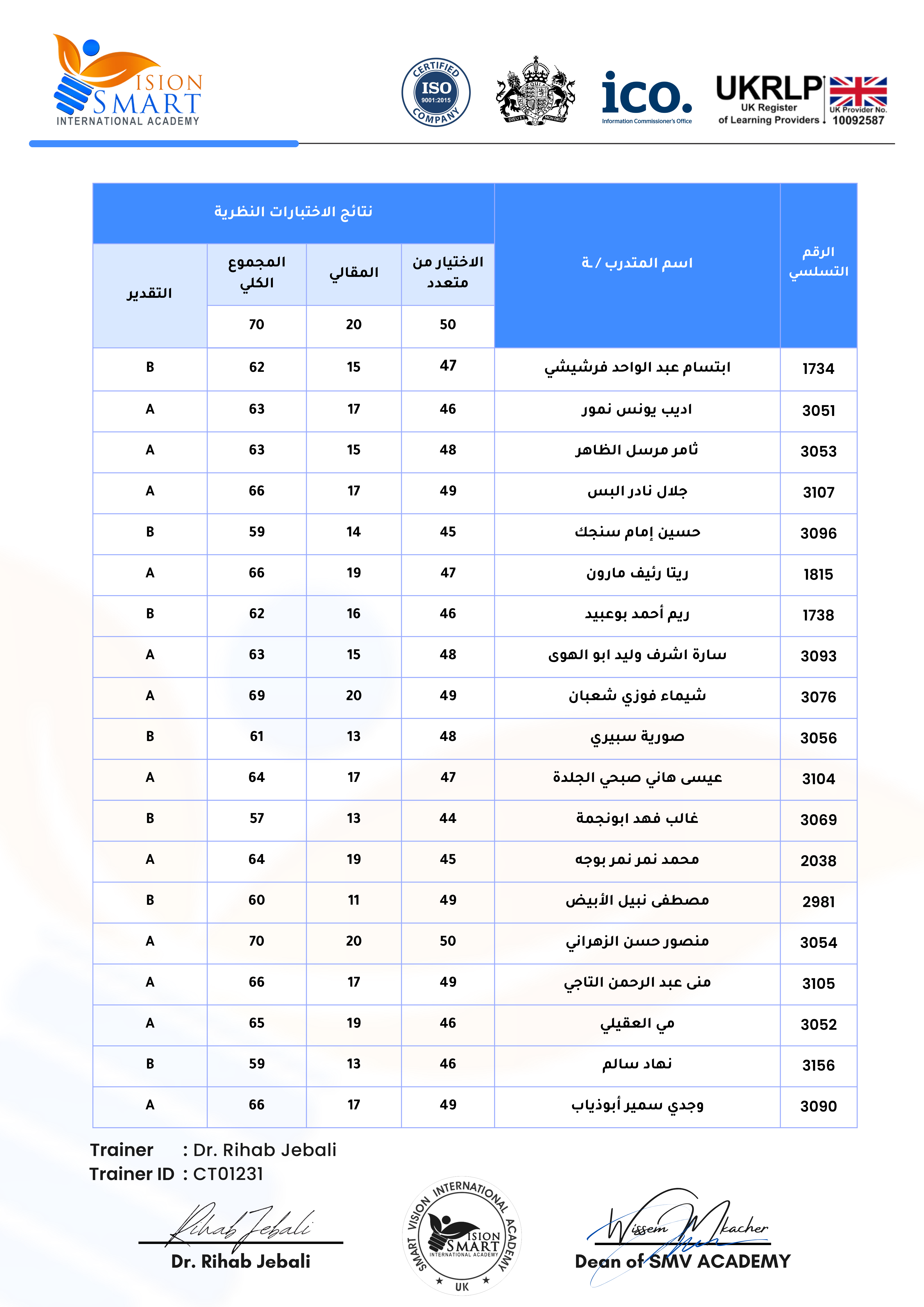 تثمن الأكاديمية النتائج التحصيلية للدفعة ما يعكس مستوى التقدم والالتزام الذي أظهره المتدربون خلال فترة تدريبهم، وتدعوهم لمواصلة الجهود في الجزء التطبيقي من البرنامج بهدف تحقيق أفضل النتائج وأعلى تقييم.