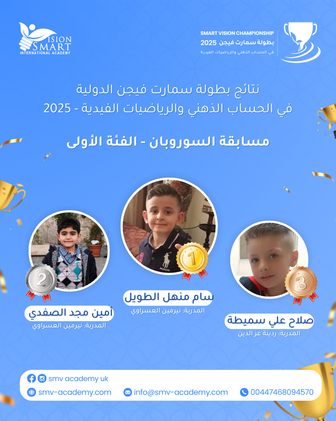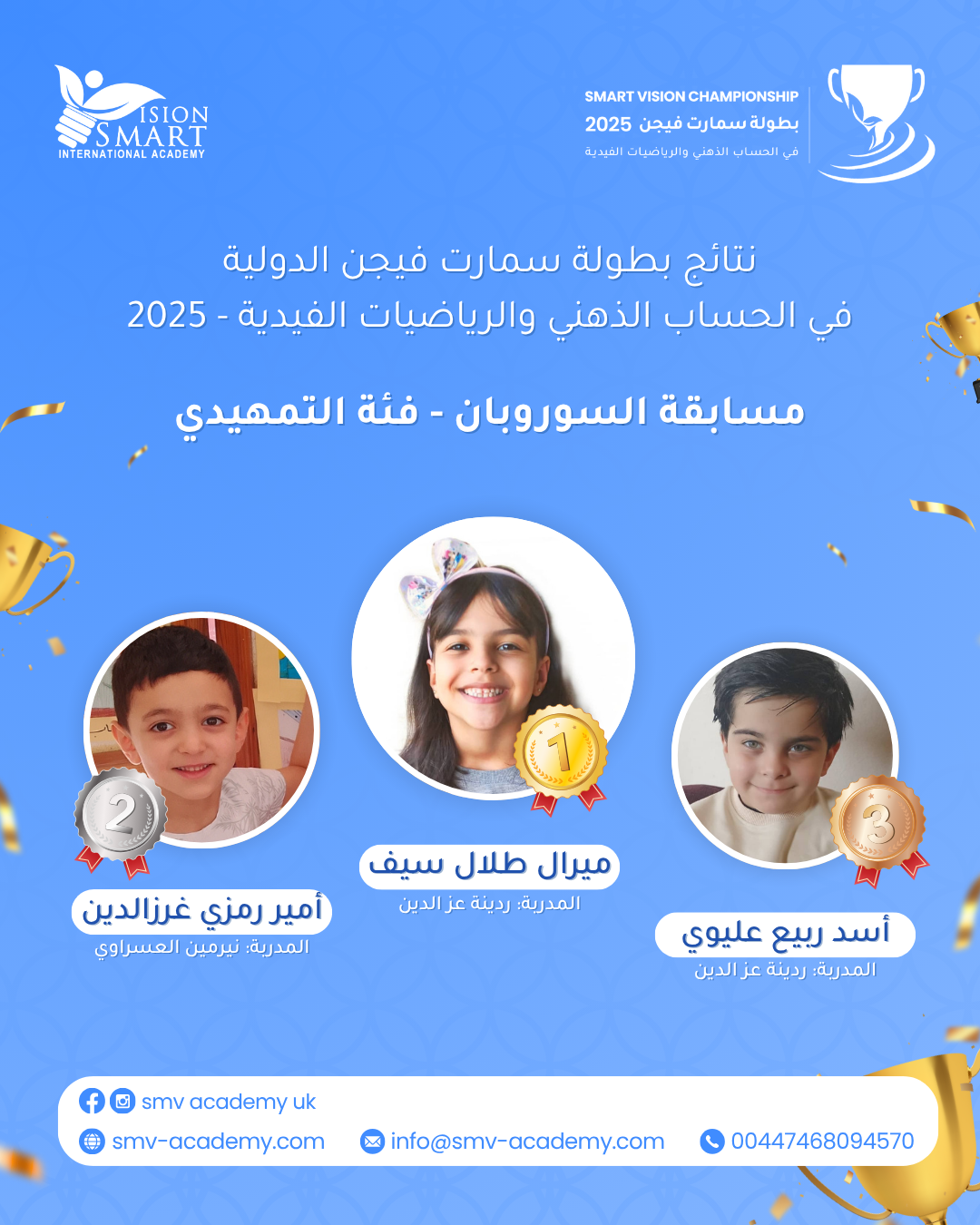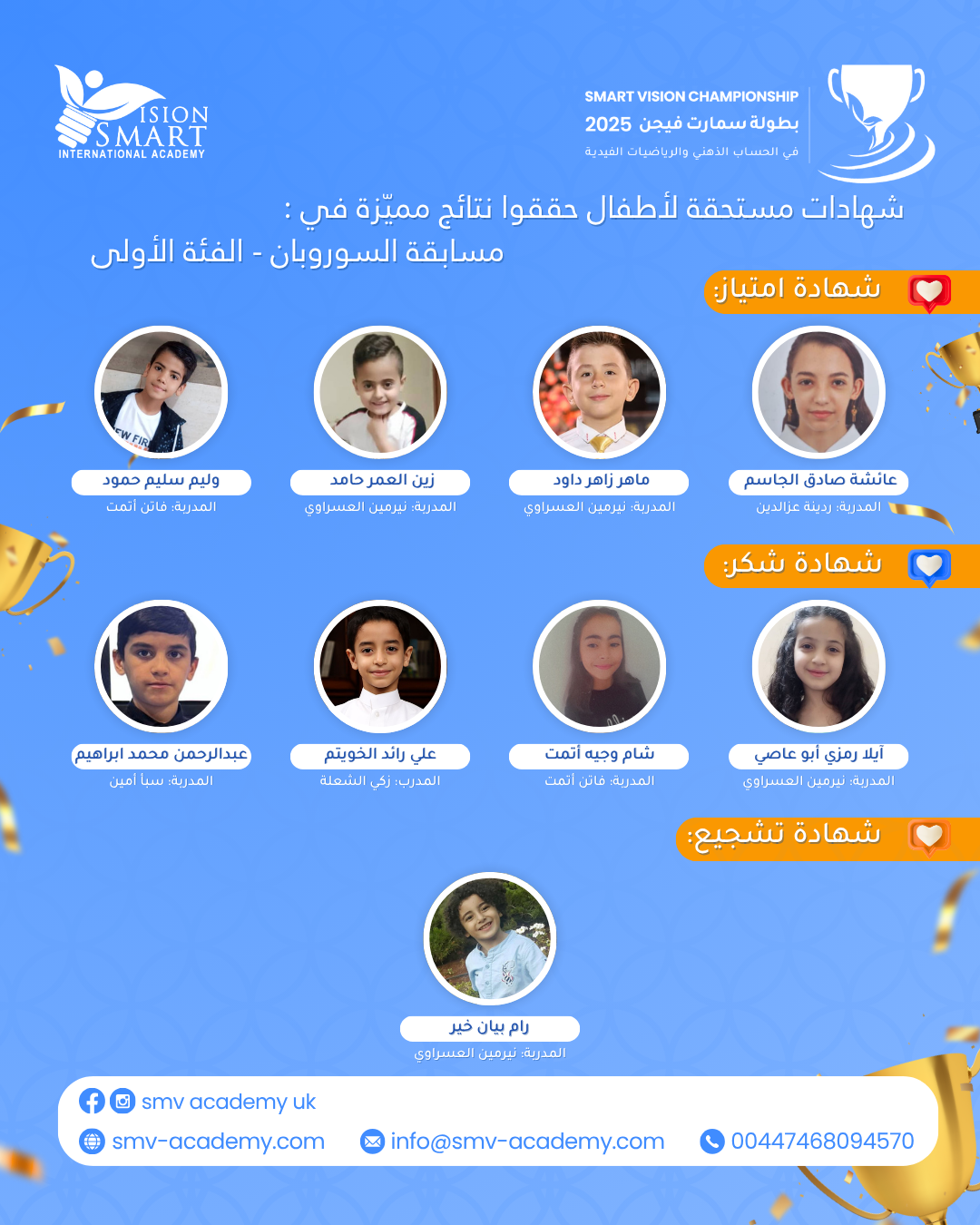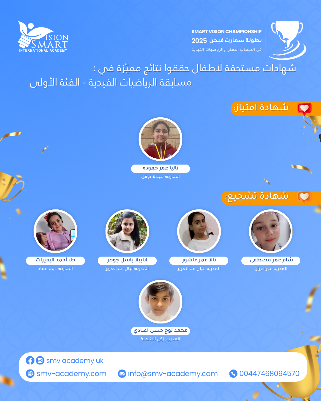 تحتفل أكاديمية سمارت فيجن البريطانية بنجاح النسخة الثانية من بطولة الحساب الذهني والرياضيات الفيدية والتي أقيمت عبر منصة الأكاديمية خلال الفترة من 14 إلى 25 أكتوبر 2025 بمشاركة أكثر من 120 طفلا من مختلف الدول ونخص بالذكر السعودية، سلطنة عُمان، سوريا، العراق والإمارات العربية المتحدة .. لقد كانت هذه الفعالية فرصة رائعة للأطفال للتألق وإظهار قدراتهم المذهلة.