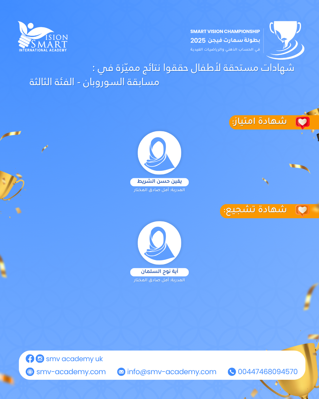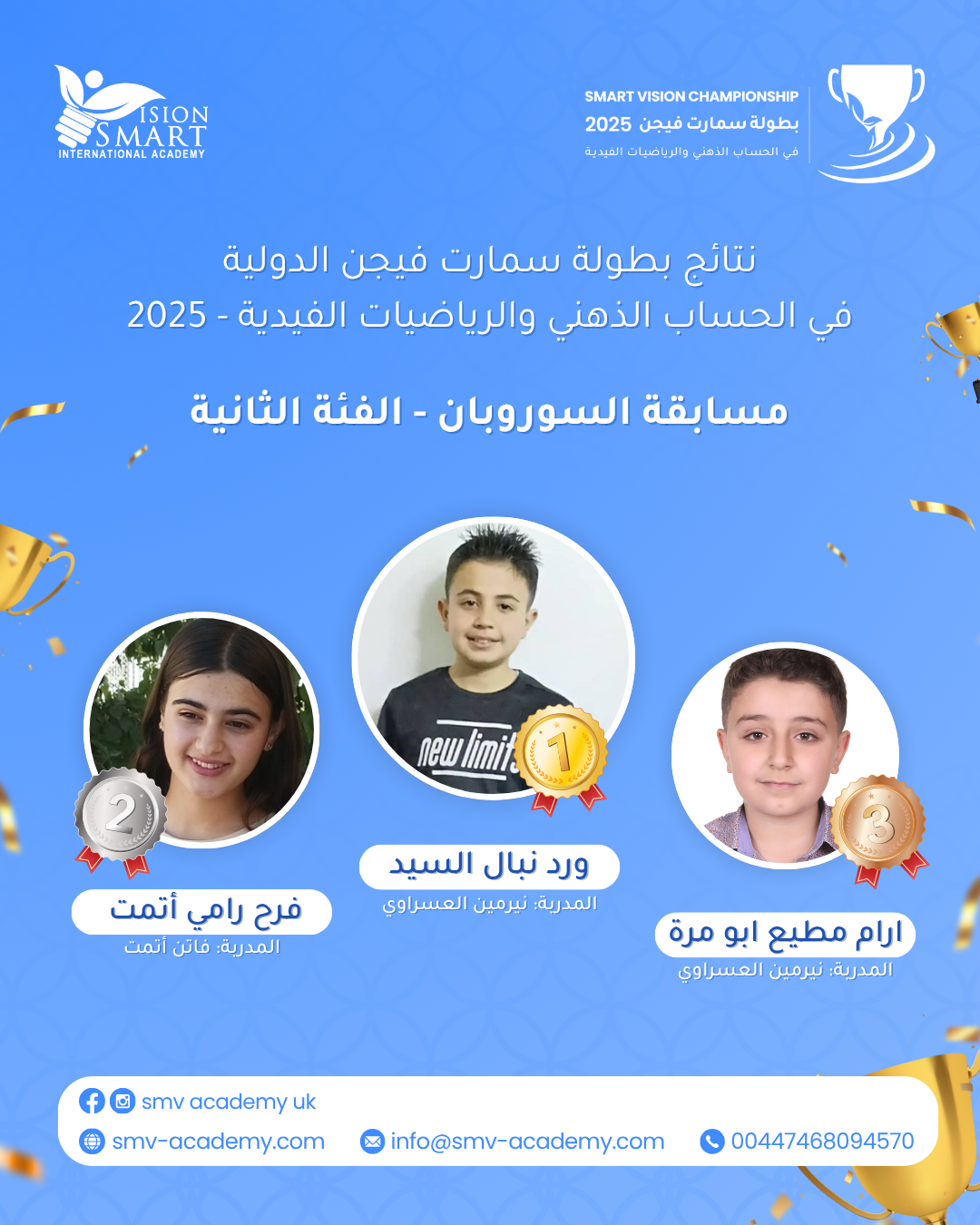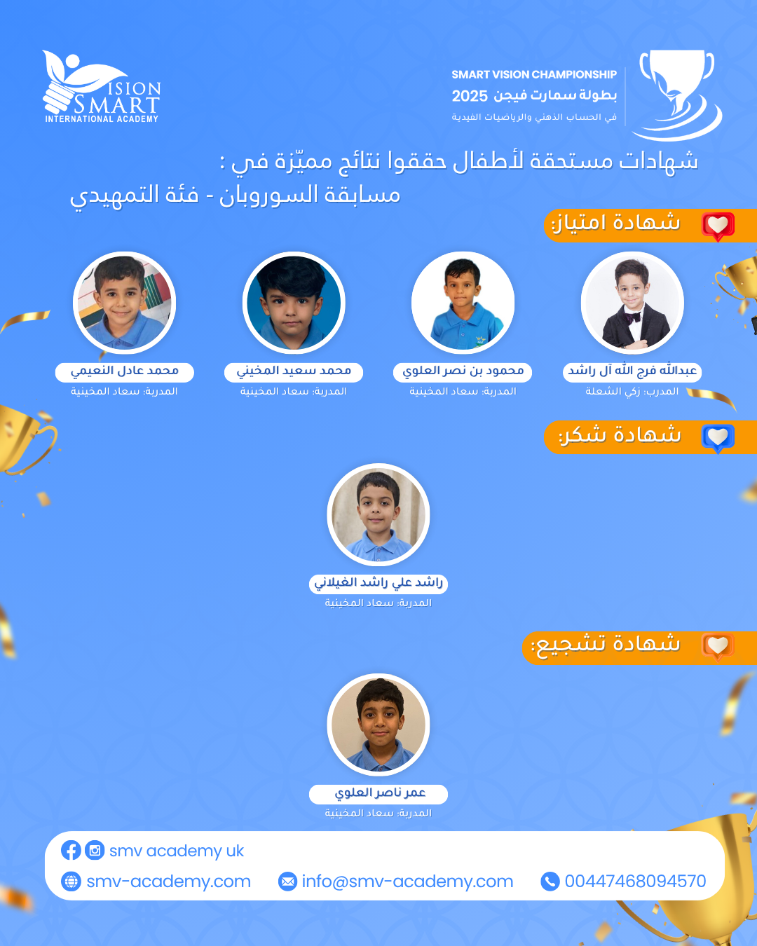 تحتفل أكاديمية سمارت فيجن البريطانية بنجاح النسخة الثانية من بطولة الحساب الذهني والرياضيات الفيدية والتي أقيمت عبر منصة الأكاديمية خلال الفترة من 14 إلى 25 أكتوبر 2025 بمشاركة أكثر من 120 طفلا من مختلف الدول ونخص بالذكر السعودية، سلطنة عُمان، سوريا، العراق والإمارات العربية المتحدة .. لقد كانت هذه الفعالية فرصة رائعة للأطفال للتألق وإظهار قدراتهم المذهلة.