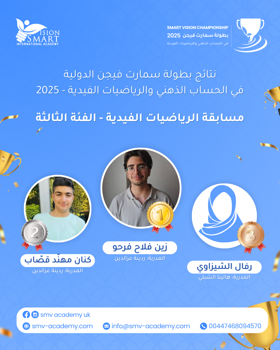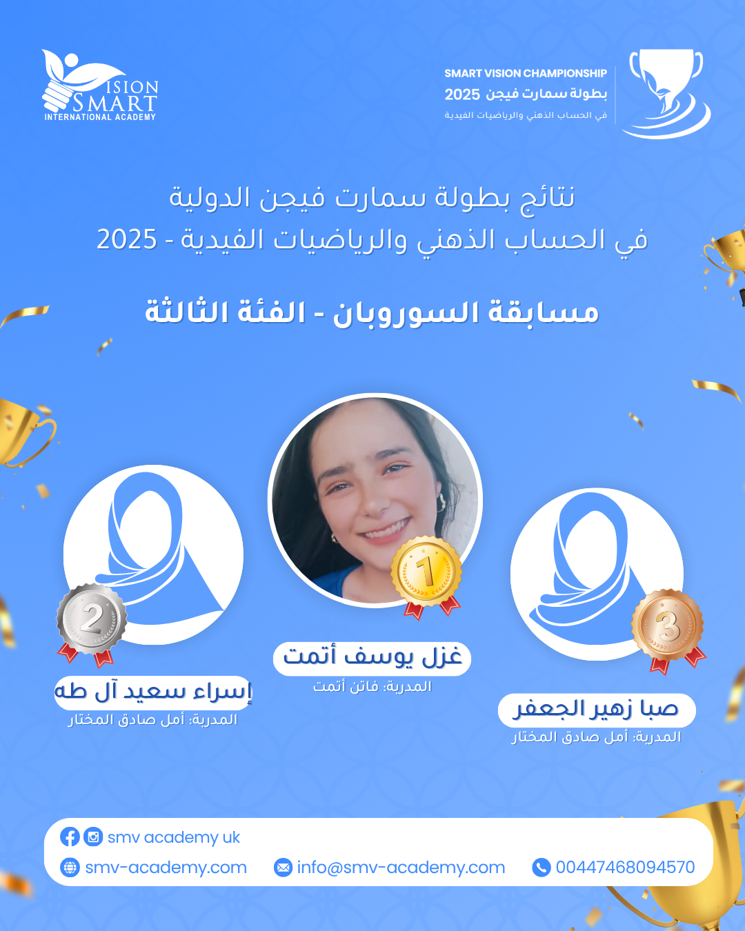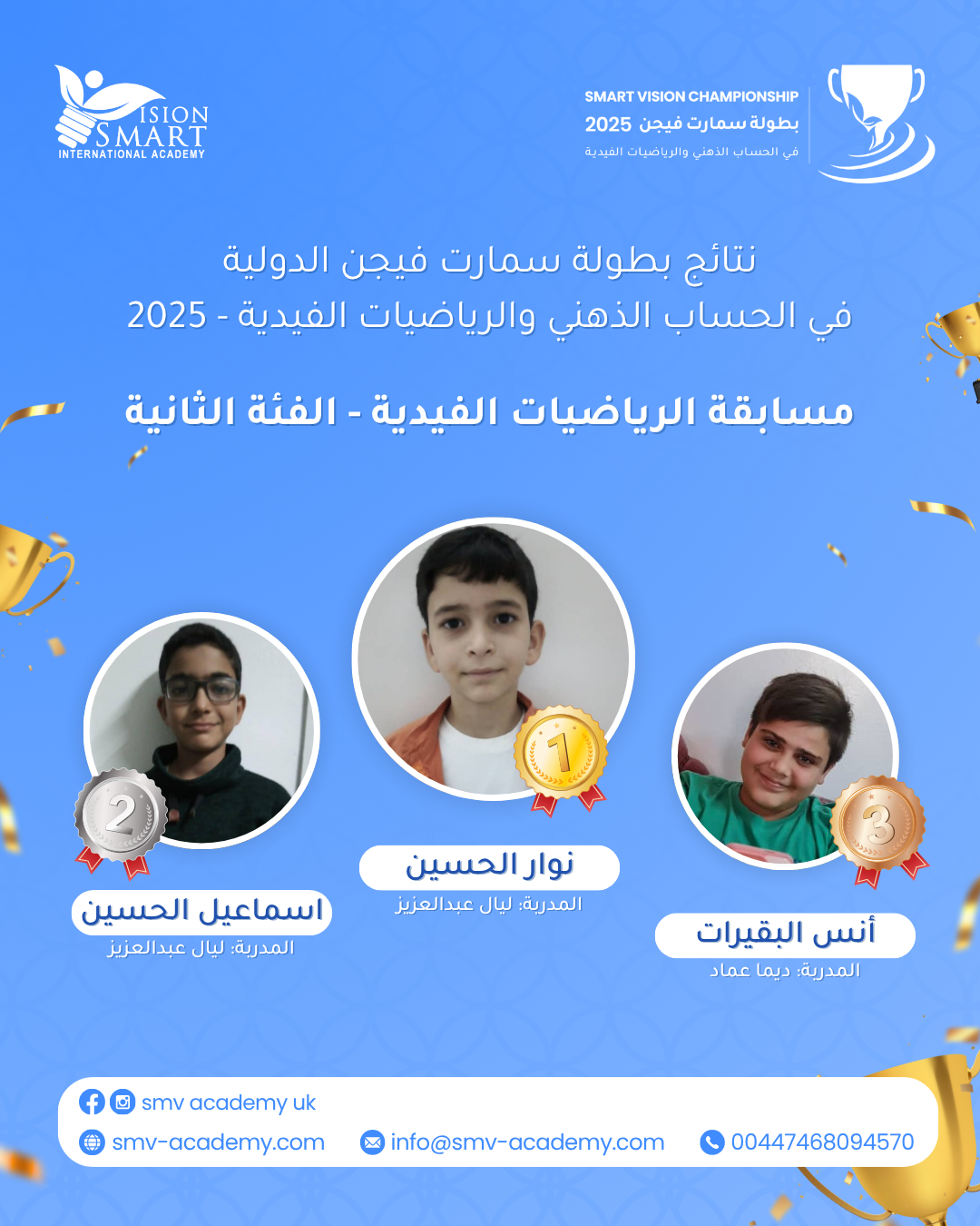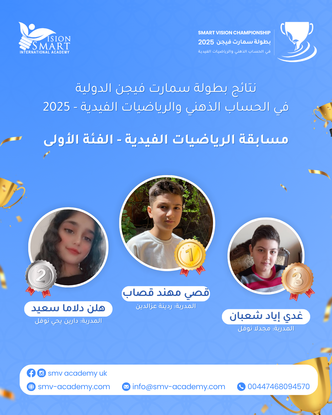 تحتفل أكاديمية سمارت فيجن البريطانية بنجاح النسخة الثانية من بطولة الحساب الذهني والرياضيات الفيدية والتي أقيمت عبر منصة الأكاديمية خلال الفترة من 14 إلى 25 أكتوبر 2025 بمشاركة أكثر من 120 طفلا من مختلف الدول ونخص بالذكر السعودية، سلطنة عُمان، سوريا، العراق والإمارات العربية المتحدة .. لقد كانت هذه الفعالية فرصة رائعة للأطفال للتألق وإظهار قدراتهم المذهلة.